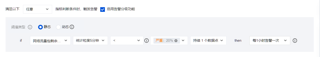 我们的个人网站服务器设想是:1核1g内存,25g硬盘,月300g流量。经过我的测试和观察,我的anjir.top网站,日常cpu占用是2%左右,内存占用是70%左右,硬盘占用是24%左右,月流量大概1%左右。所以我设置的告警如下图,你也可以结合自己的情况,设置更加合理的告警。
